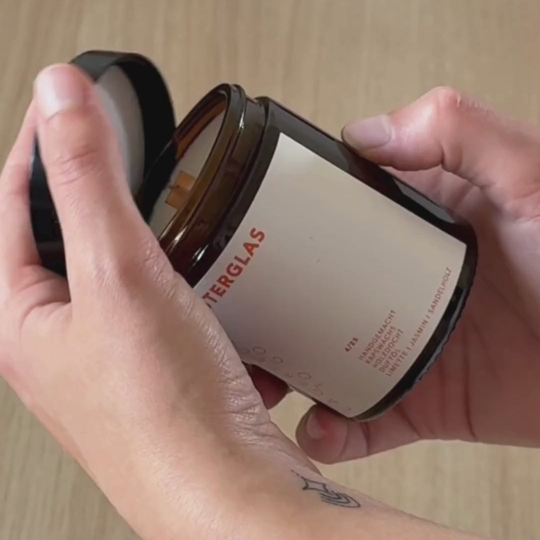 Die Kerze befindet sich in einem Braunglas mit Kunststoffdeckel (Schraubverschluss)